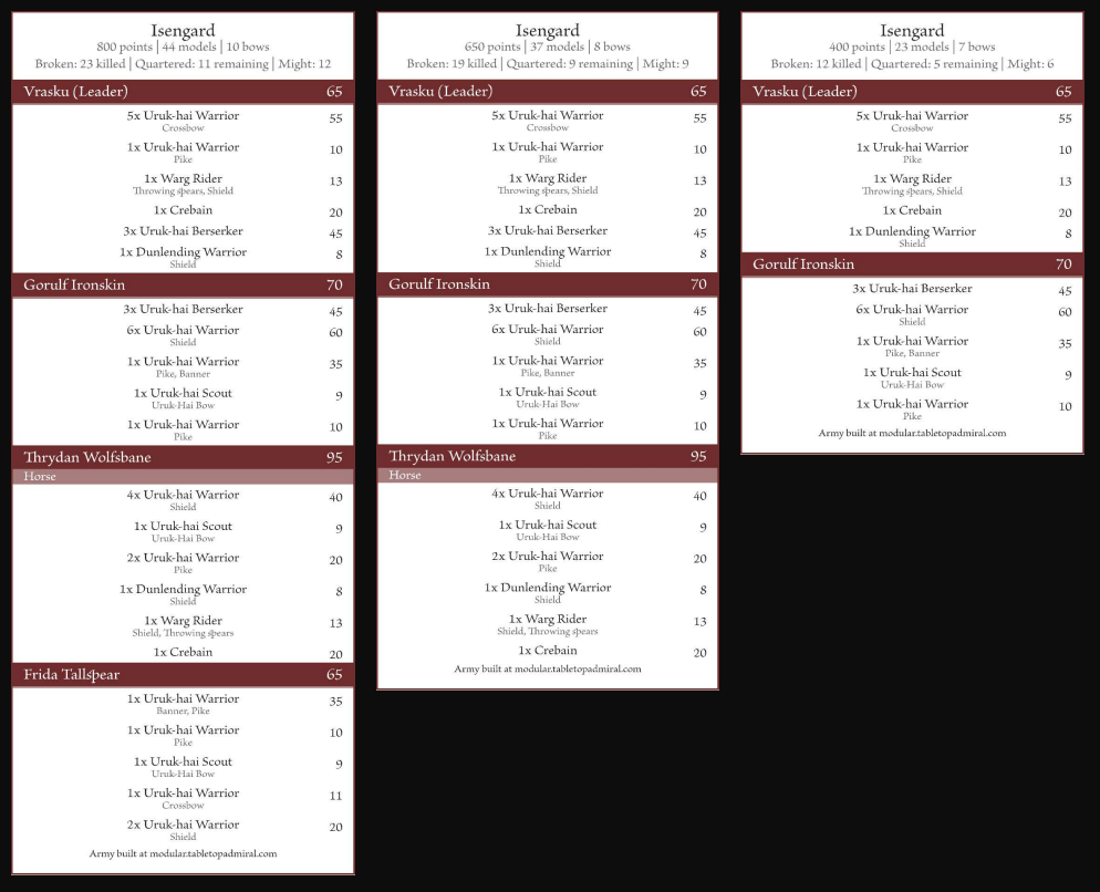 Well… TO WAR we go! A few weekends ago, I attended the Blue Mountains Brawl tournament near Ashville, North Carolina. I certainly had my work cut out for me this tournament as I would go toe-to-toe with the number 1 and number 2 ranked players in the Southeastern United States (based on current SMEGL Standings)! I guess in order to be the best you have to try and beat the best! This tournament was an escalation event spanning six games over two days. The tournament layout was two games at 400 points followed by two games at 650 points and lastly two games at 800 points. After reading over the player packet (I recommend always reading these thoroughly) and seeing that a requirement to podium was to be playing with a fully painted army and since I signed up somewhat last minute, I decided to go with my trusty (untrusty) yet fully painted Isengard army. Below is my 800 point Isengard list broken down into the 400 and 650 point lists as well (feel free to make fun of them in the comments)
