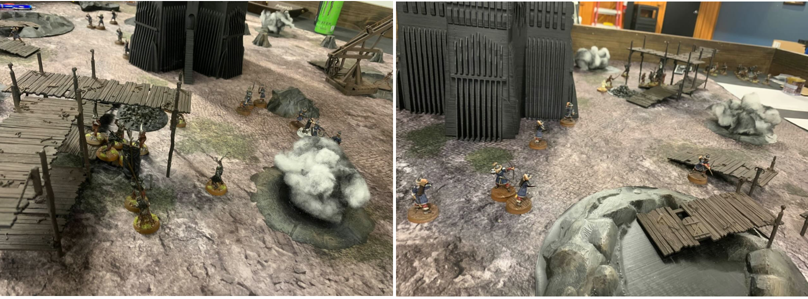 Game 2 was against Michael who was running Minas Tirith lead by Gandalf the White. This was the second and last 400 point game. We played clash by moonlight. This board was on the old citadel realm of battle tiles and showcased Conquest Creations Kingdom of Azragor buildings. You can get your hands on your own set of these buildings by checking out my shop! (ok shameless plug over). This game ended up going to time as the first few turns we were jockeying heavily for position. I got my crossbows within the 12 inch range required in clash by moonlight and the +1 to wound really helped mow down a line of Minas Tirith Warriors. My Berserkers backed up by pikes were no match for his charging Knights. Michael was able to get two heroic combats off with Gandalf to try and even the numbers, however Gandalf would eventually run into Gorulf who with his free heroic defenses was able to lock up Gandalf for several turns and even managed to win a fight to expel Gandalf of all his fate but was not able to wound. At the end of the game neither of us ruined the enemy leader or lost a hero. I was able to break him and I was not broken. This resulted in a 6-1 Major Victory for Isengard! Michael was a great opponent who is newer to the game, I gave him what bit of advise I had and he went on to win his next two games, so maybe I do know a thing or two!